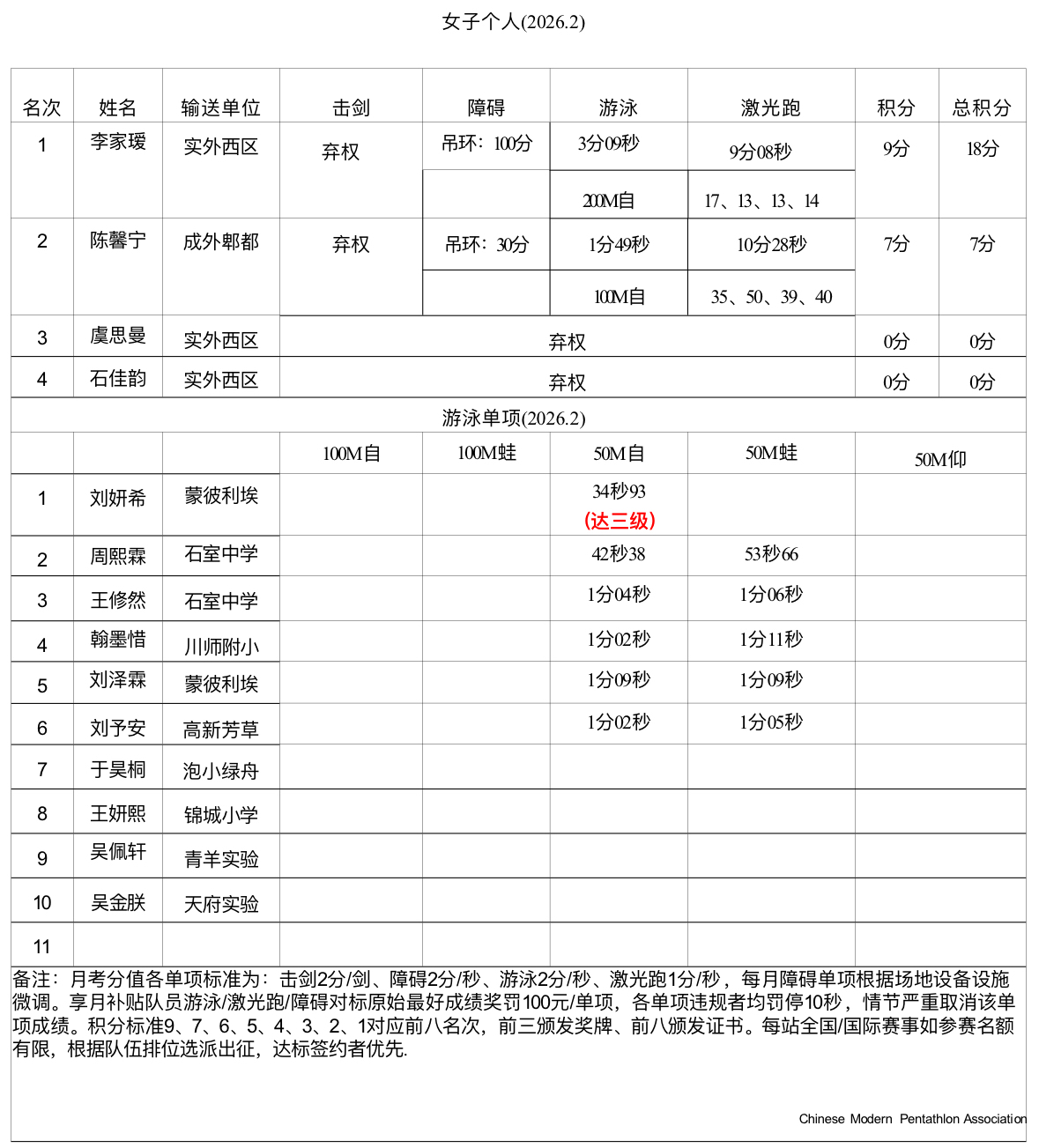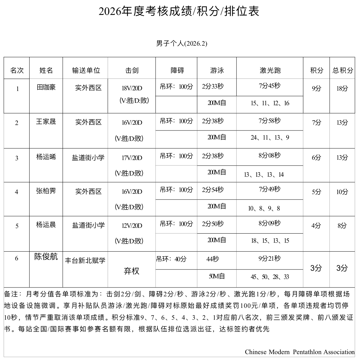 现代五项青少年运动队考核成绩公示(二月)